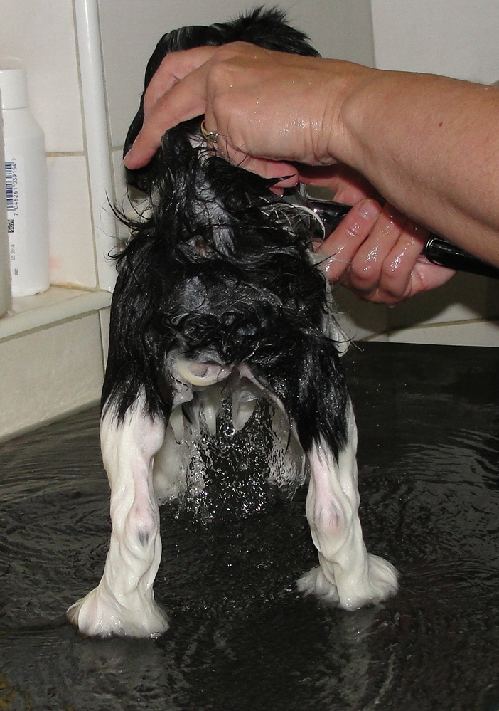 Tänään oli Sagan ja Nupun pesupäivä. Nuppu lähtee huomenissa valloittamaan sydämiä Tampereelle ja niinpä molemmat neitoset pääsivät kylpemään. Ensin väsytettiin lapsukaiset pihaleikeissä ja sitten mentiin pesulle. Hyvin käyttäytyviä neitejä. Ihan kuin vanhoja tekijöitä. Föönaus ei ollut mitään, sitähän ollaankin jo "kuiva"harjoiteltu monen monta kertaa aiemmin, mutta tänään sitten lämmin puhallus osuikin omaan turkkiin. Mutta eipäs mitään...
